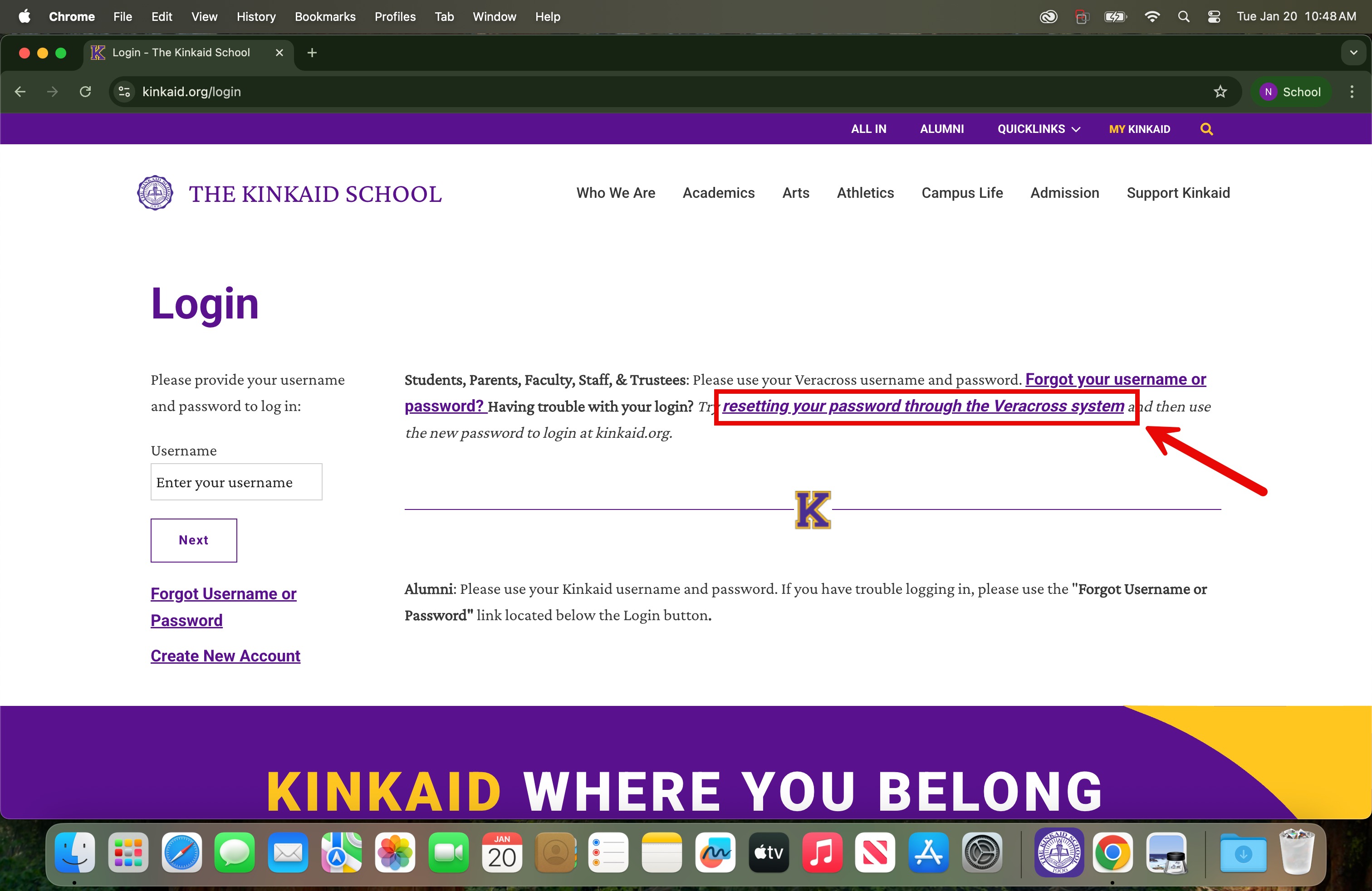 - If you've never set one up or don't remember it, click on this link: https://accounts.veracross.com/kinkaid/accounts/forgot_password.