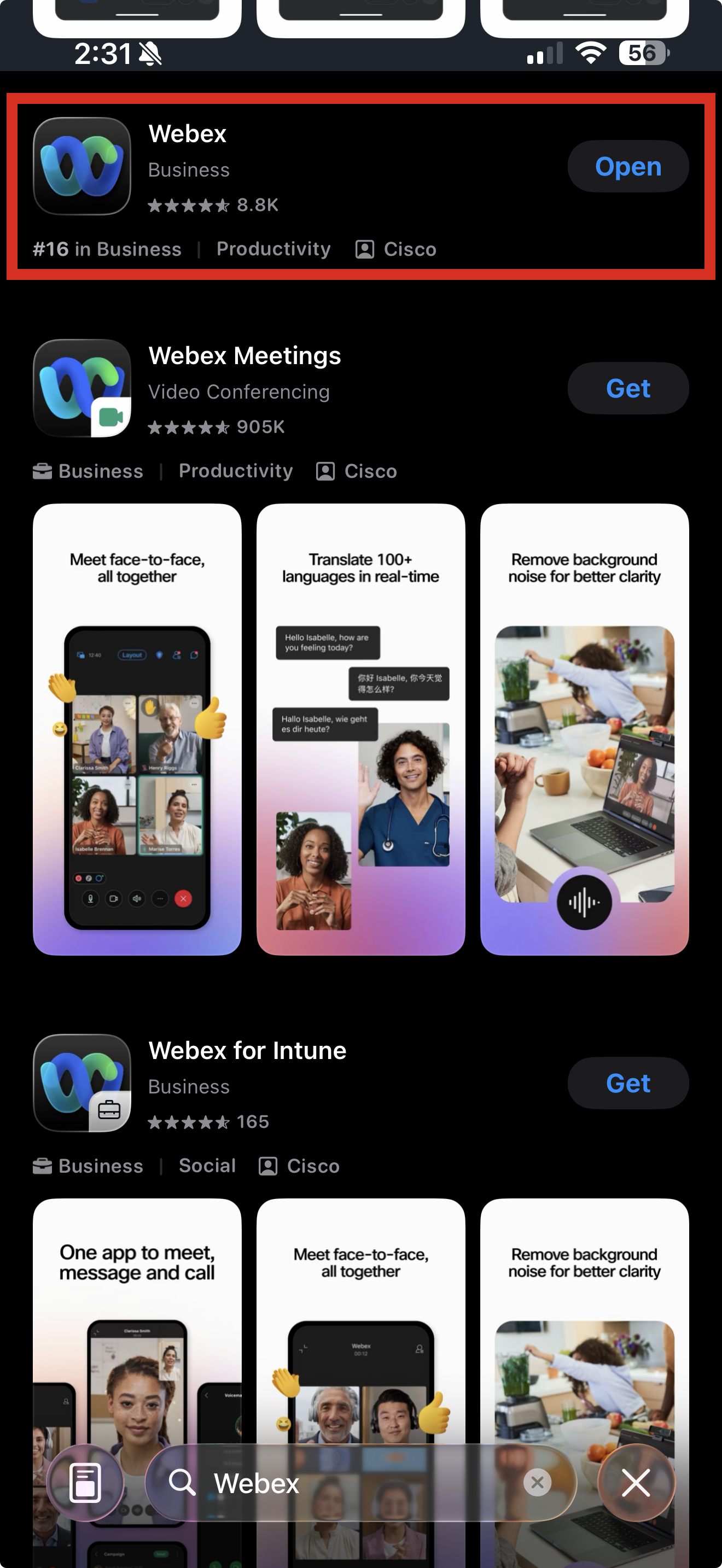 1. Open the Apple App Store and search for "Webex" (ensure it's the "Webex" app, not "Webex Meetings" or "Webex Events").