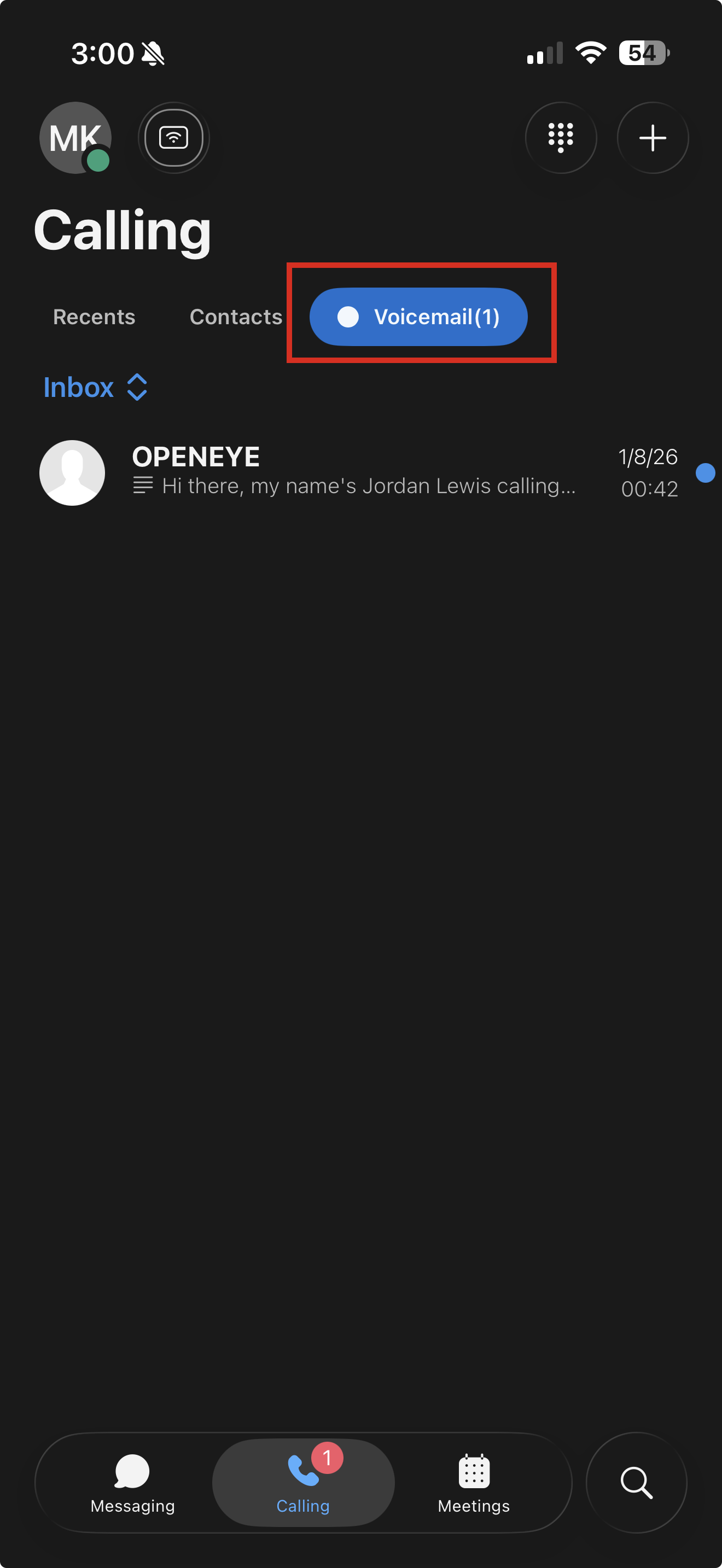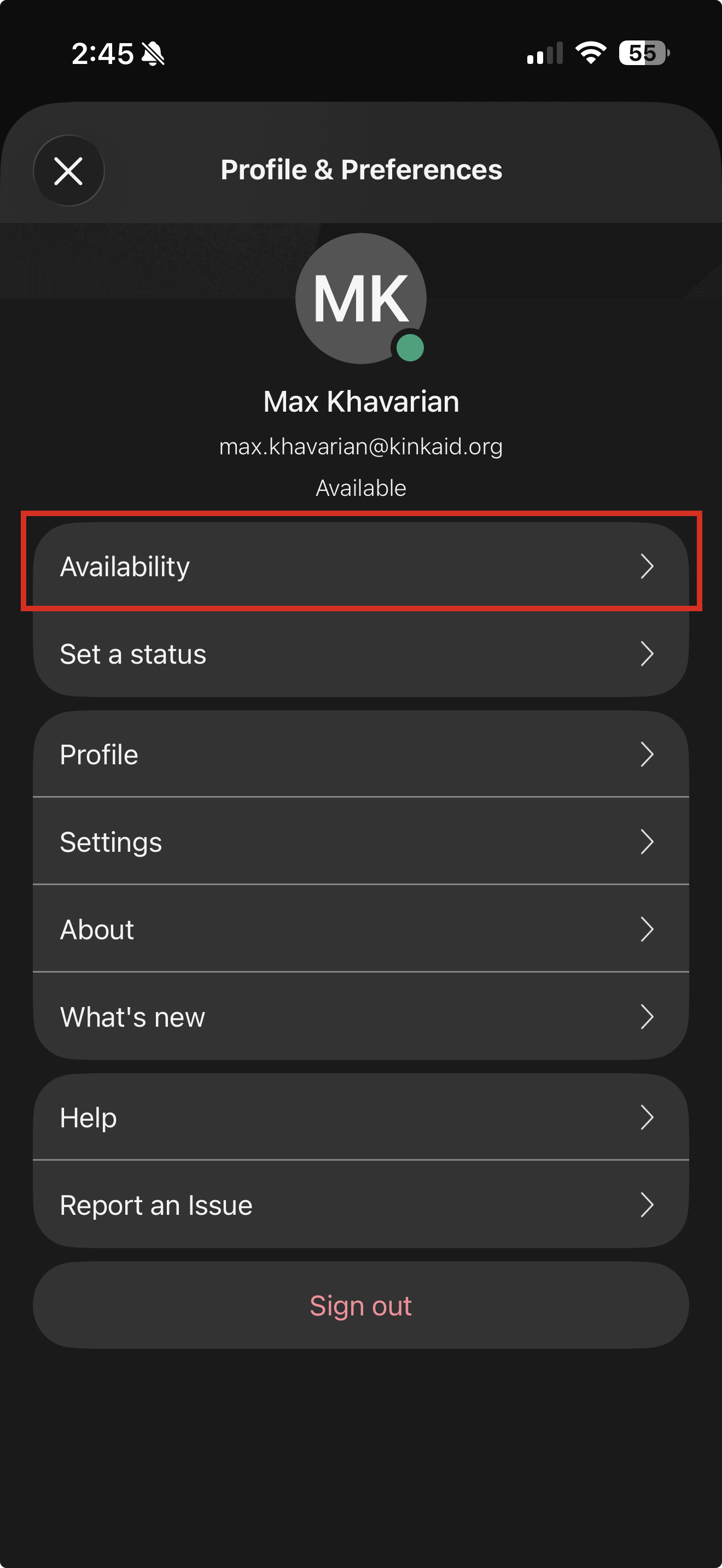 - Manage your availability, call forwarding, and status through the settings menu (top-left corner) by tapping on your initial.